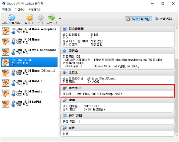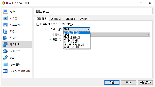 이를 변경하기 위해서 설정하기 원하는 가상 머신을 선택한 후 (위에서는 Ubuntu 16.04가 선택) "머신 > 설정 > 네트워크"를 선택한다.