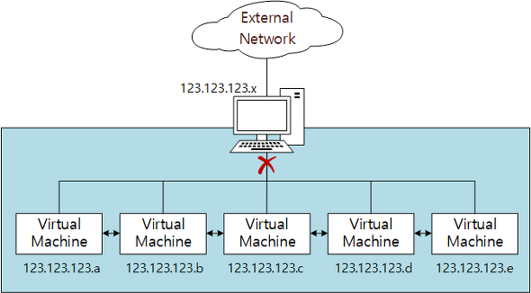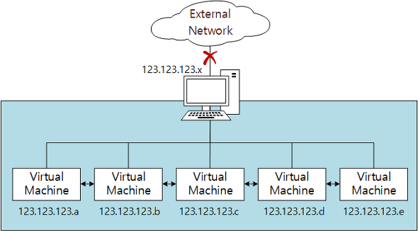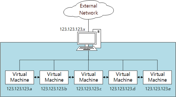 즉, 아래 그림과 같이 NAT 모드일 경우 192.168.0.1의 주소를 사용하는 가상 머신은 외부 네트워크와 통신할 때 123.123.123.x 주소를 달고 외부와 통신하게 된다. 반면 192.168.0.x 의 주소를 가진 다른 가상 머신들과는 통신이 불가능하다.
