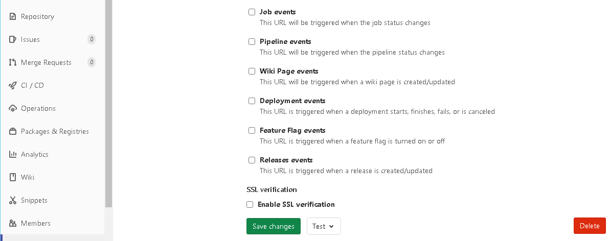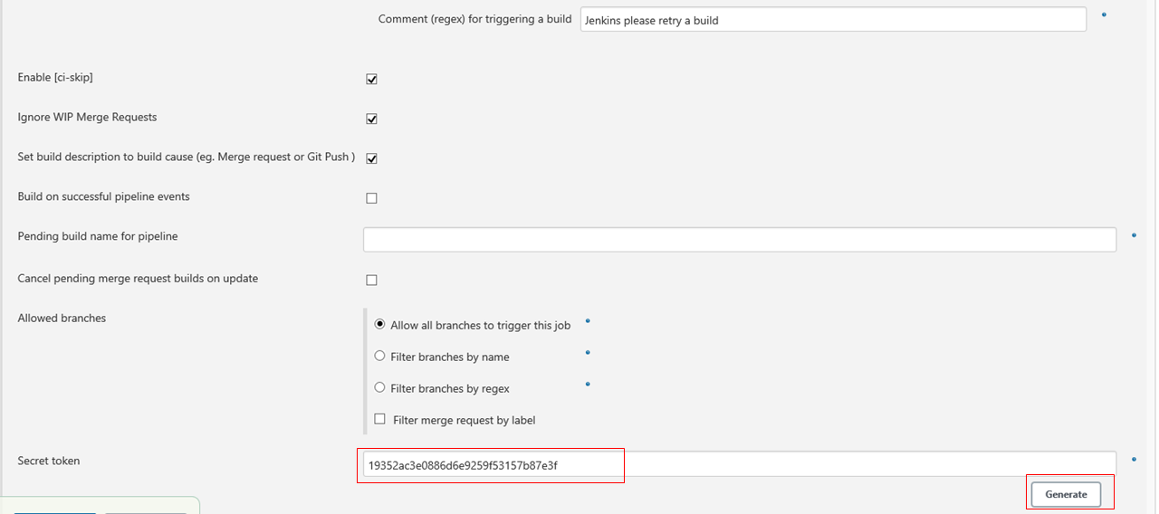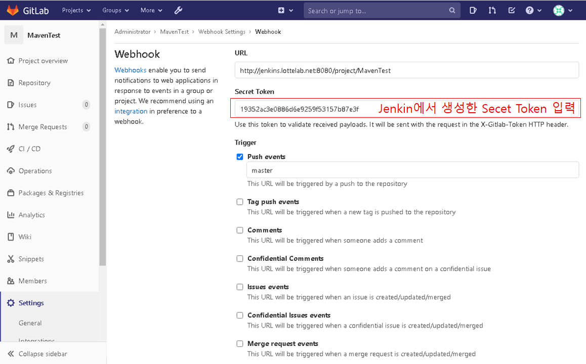 Gitlabe에 Sub -> Master로 Push 이벤트 발생시 Web hook -> 젠킨스 Build 자동 실행 설정, 이를 위한 Gitlab 연결 Secret Tocken 생성