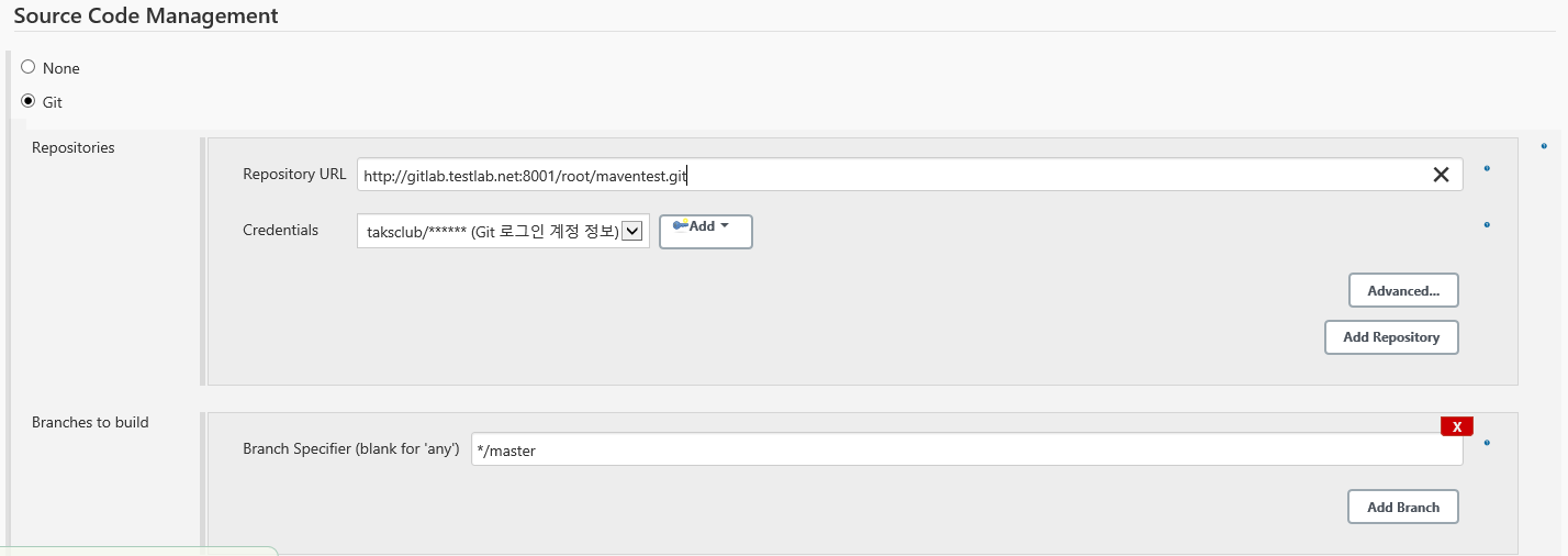 소스 코드가 존재하는 Git Repoisotry URL 및 접속 계정 등록